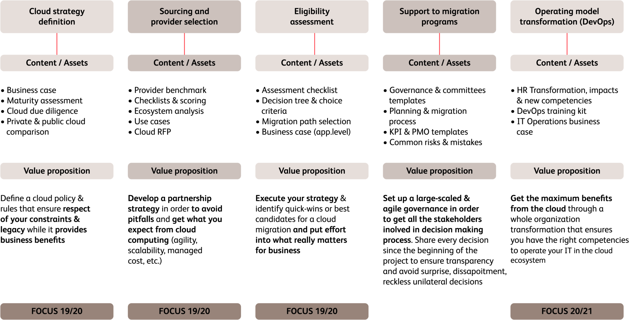 After defining the Cloud strategy, BearingPoint can help an organization through the complete transformation program: provider selection, eligibility assessment, Cloud migration, operational model transformation.