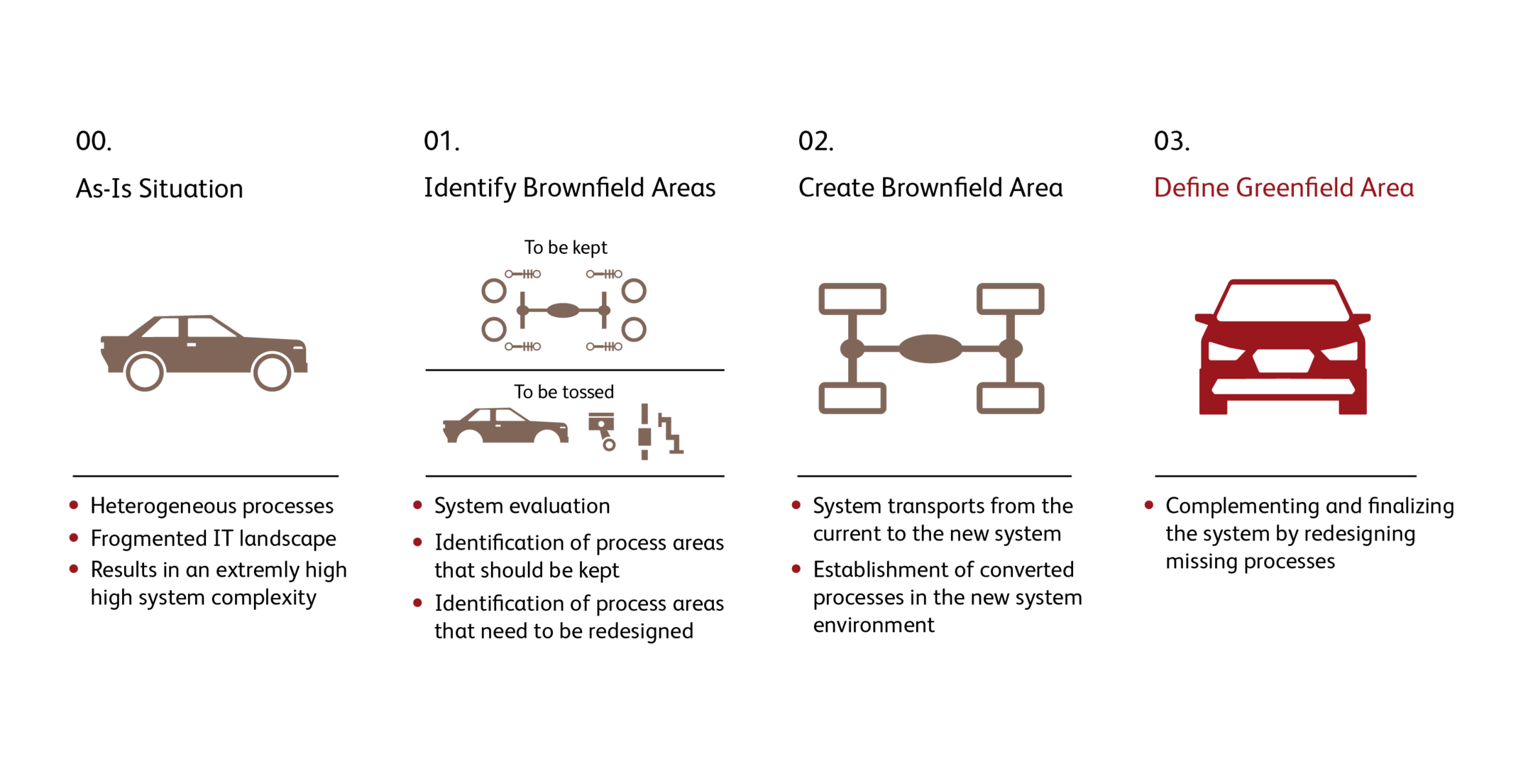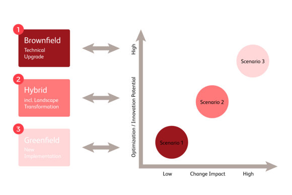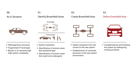 In the past, many of our customers from the automotive industry have decided to carry out their transformation projects based on fundamental process restructuring (greenfield). However, more and more customers are also requesting concepts with shorter project durations that are nevertheless as efficient as possible to sustainably improve the current complexity and heterogeneity in selected business processes. To achieve the most significant benefit from a conversion to S/4HANA in this way, an intelligent hybrid approach is required. This approach aims to quickly leverage the benefits of S/4HANA through “quick wins” while avoiding a time-consuming, very extensive redesign of business processes.