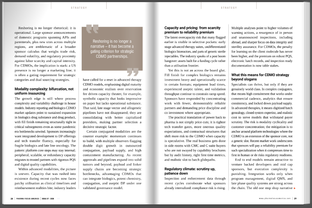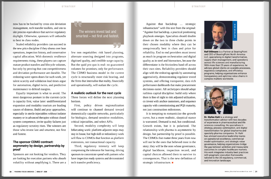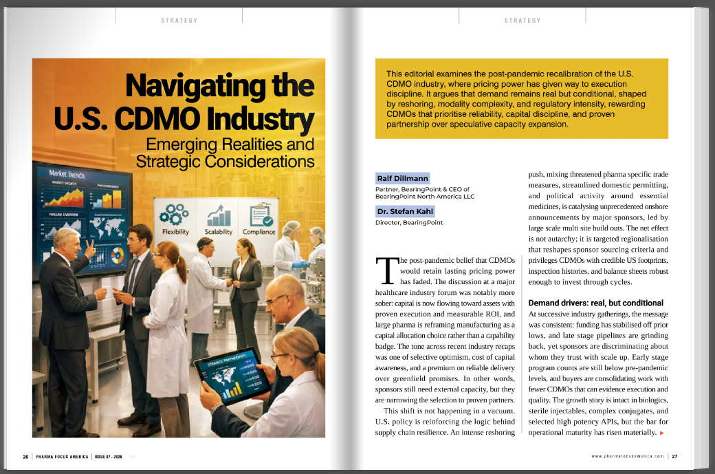 In the latest issue of Pharma Focus America, BearingPoint leaders Ralf Dillmann and Dr. Stefan Kahl examine two of the most defining shifts shaping the U.S. pharmaceutical and CDMO landscape in 2026