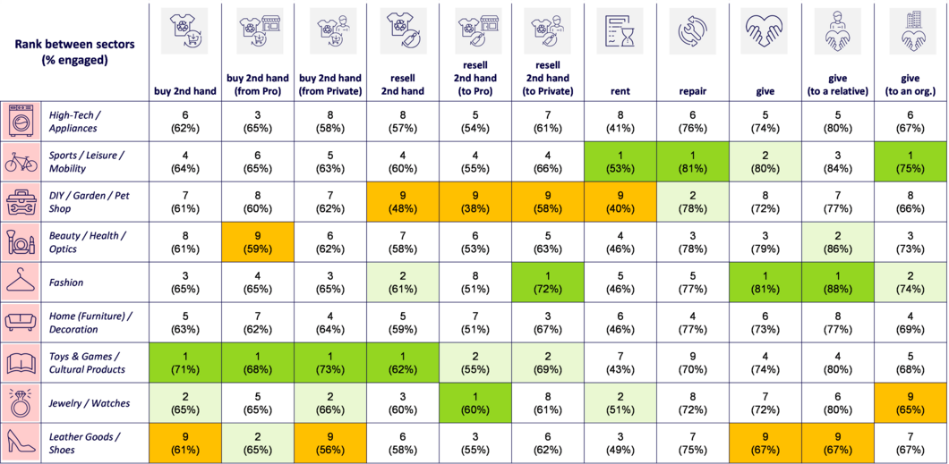 Renting and repairing are practices more adopted in the Sport/Leisure/Mobility sector, with 53% and 81%, respectively, at the European level.
