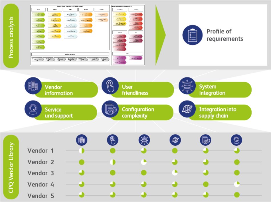 By matching your requirements with these key factors, we can generate a fast and flexible overview of potential vendors for your requirements by using our CPQ Vendor Library.