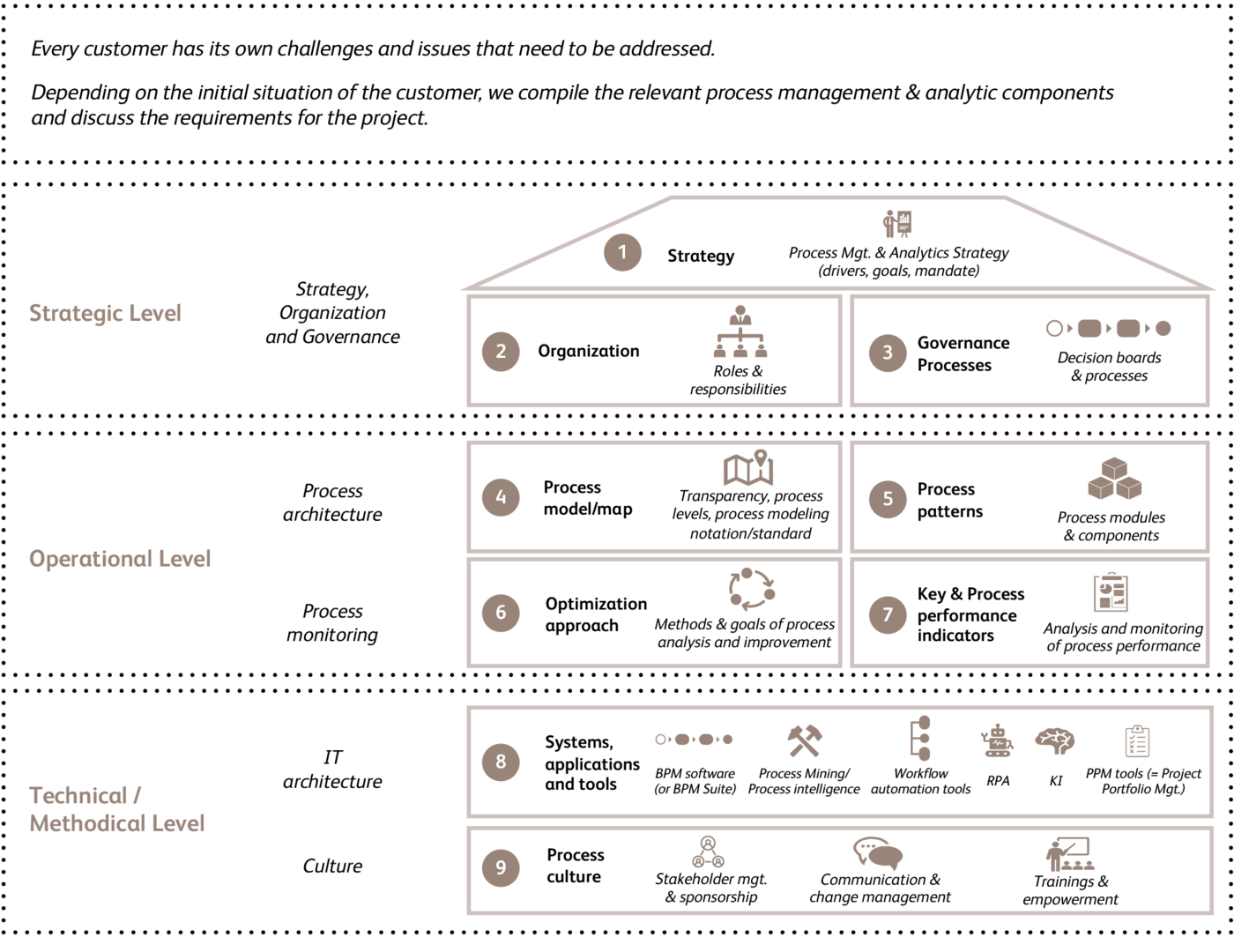 1. Development of a process management strategy for your company (for example) based on an organizational BPM maturity analysis, which can be used to determine the status quo and a target picture for BPM in your company and thus serve as a basis for planning further steps.