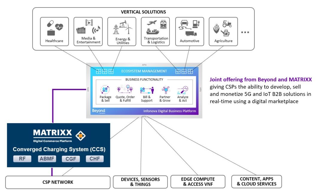 Amsterdam & Foster City, CA – May 19, 2021 – Beyond by BearingPoint and MATRIXX Software today announced they have partnered to give Communications Service Providers (CSPs) the ability to develop, sell and monetize 5G and IoT B2B solutions in real-time using a digital marketplace. The integration of Beyond’s Infonova Digital Business Platform with MATRIXX Software's Digital Commerce Platform will enable CSPs to combine connectivity and network slicing capabilities with technology solutions like IoT, Edge and Cloud, third party services and vertical industry applications to unlock new revenue and growth models.