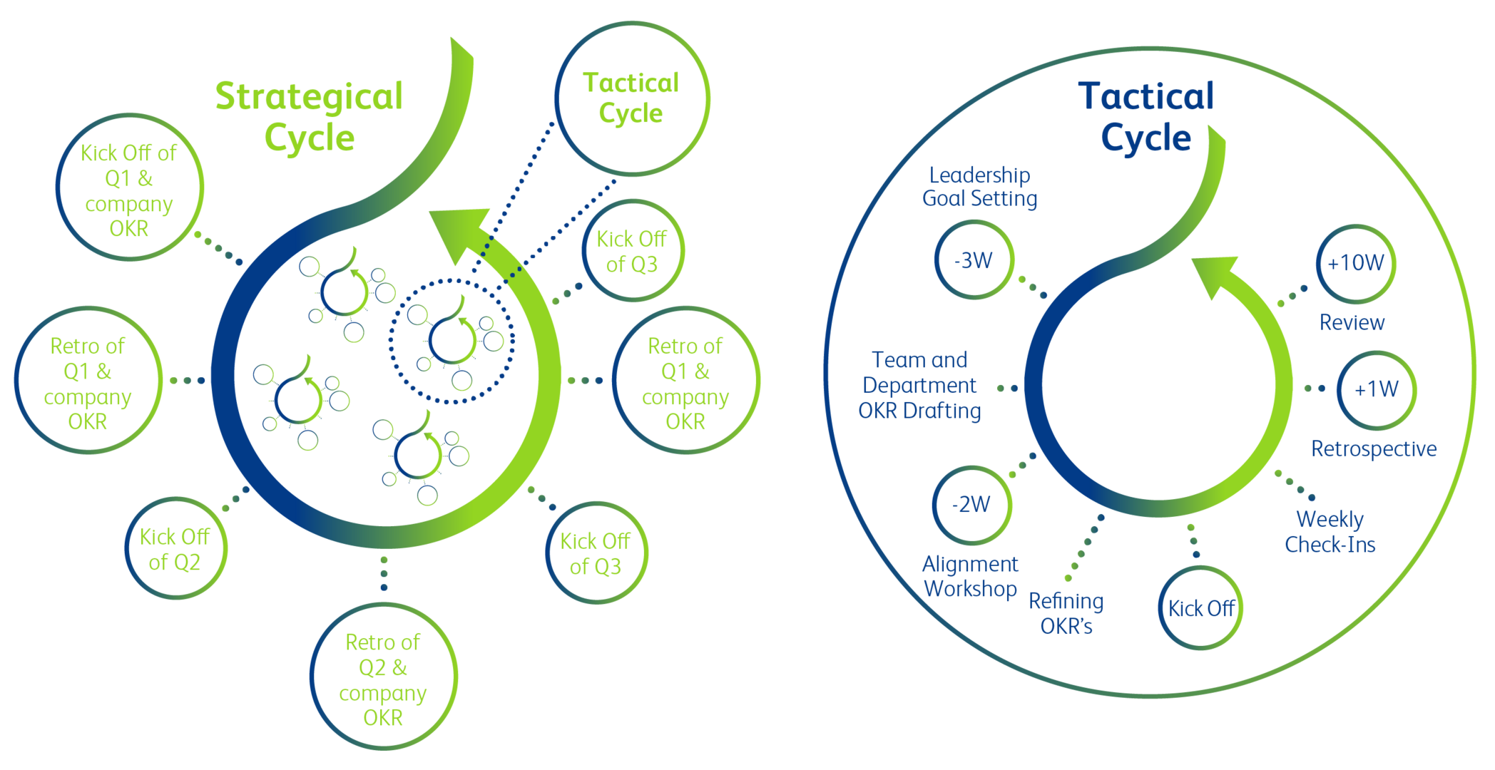Another centerpiece of OKRs is that they do not cascade as MBOs because OKRs understand that strategy and tactics have different natural paces since the latter tend to change much faster. Whereas there is usually a so-called strategical cycle on a company level of 12+ months, the tactical cadence is mainly 3 months or longer.