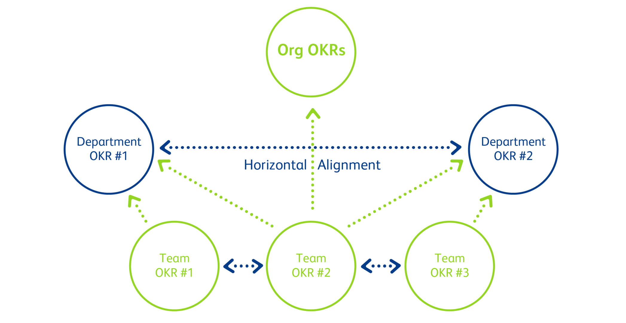 The three alignment mechanisms as described above foster affinity and transparency in the organization. Connecting teams under the umbrella of a joint objective allows everyone to become responsible for supporting each other and accomplishing goals. The important objectives connect everyone in the organization vertically, horizontally, and diagonally. The top-down alignment brings more meaning to the respective work, while bottom-up OKRs cultivate engagement and foster innovation.