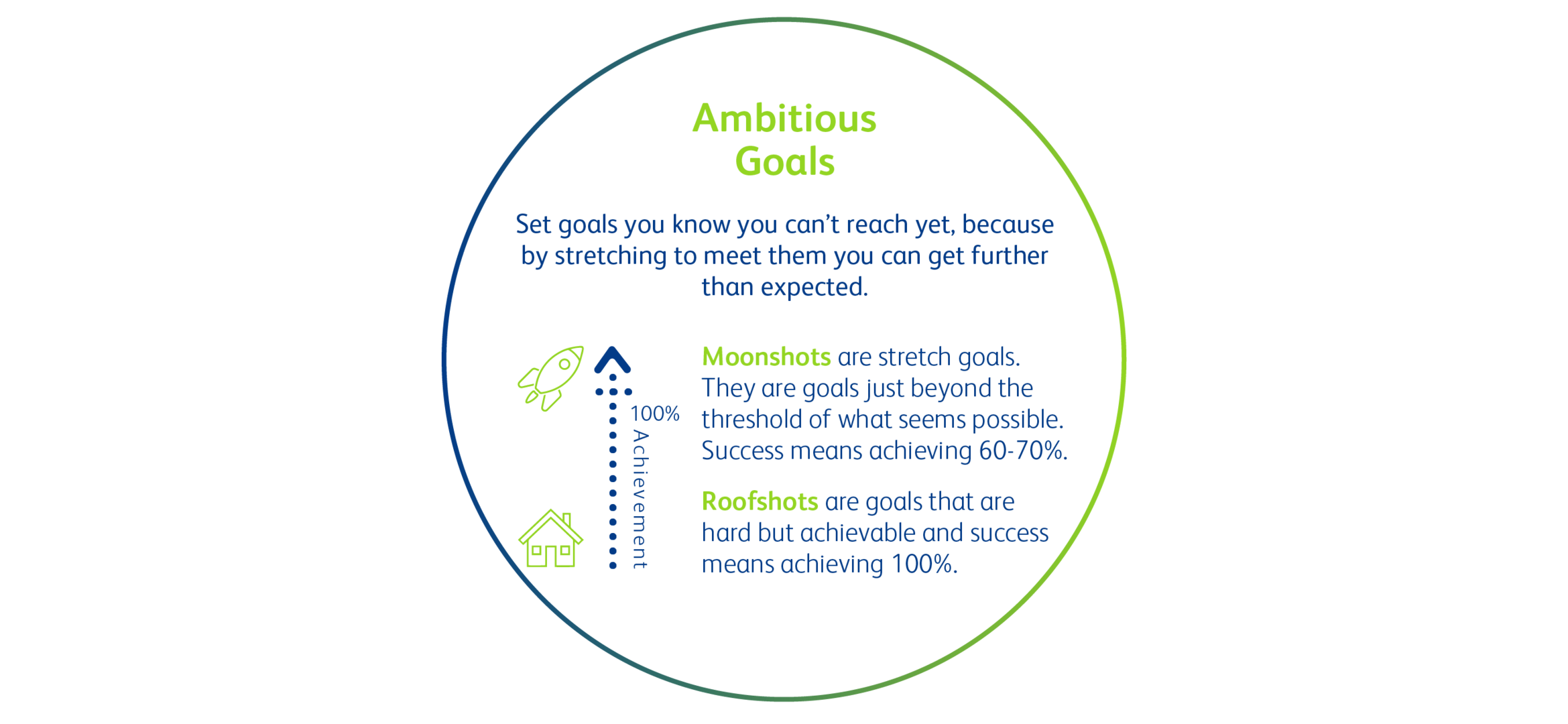 Using so-called moonshots and roofshot goals are the mainsprings. Moonshots are stretch goals. They are goals just beyond the threshold of what seems possible. Success means achieving 60-70%. Roofshots are ambitious but achievable goals, and success means achieving around 90% to 100%. The philosophy behind OKRs is that if the company continually reaches 100% of all goals, they are too easy, and there is no atmosphere created where accelerating is the norm. Momentum and flow are more relevant than micromanagement and 100% completion rates.