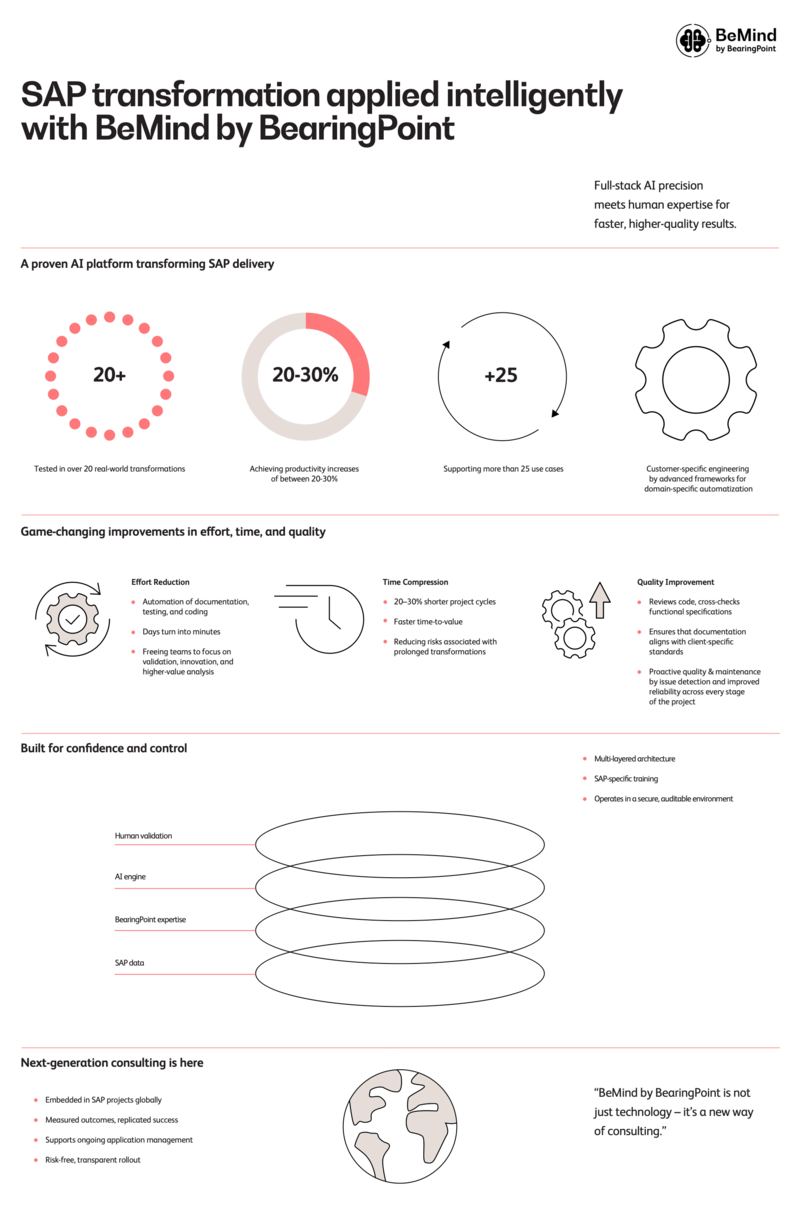 Amsterdam, November 20, 2025 – SAP transformation projects are often complex and resource-intensive. BearingPoint’s new AI-powered platform, BeMind by BearingPoint, tackles these challenges head-on by streamlining processes, accelerating delivery and timelines, reducing effort and improving quality. Developed and refined over 18 months, the platform combines advanced artificial intelligence with the management and technology consultancy’s deep technical and delivery expertise, delivering measurable and repeatable productivity gains across large-scale SAP programs.