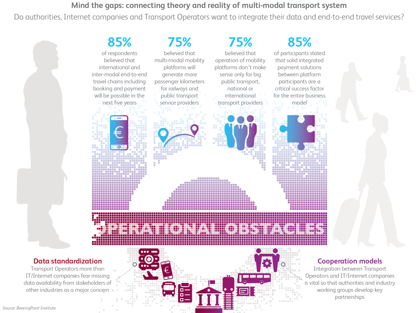 Berlin/Paris, June 27, 2017 – It is a given that travelers – be they commuters, tourists, long distance or day-to-day customers – expect seamless, multi-modal journeys. But what do public transport operators believe? The BearingPoint Institute, the research arm of management and technology consultancy BearingPoint, surveyed 59 transport operators and other stakeholders from nine European countries as well as Japan and the US to get their perspective on intermodal mobility platforms. Whilst a clear majority recognized the inevitability of multi-modal end-to-end travel chains, the same proportion (85%) noted an array of challenges standing in the way.