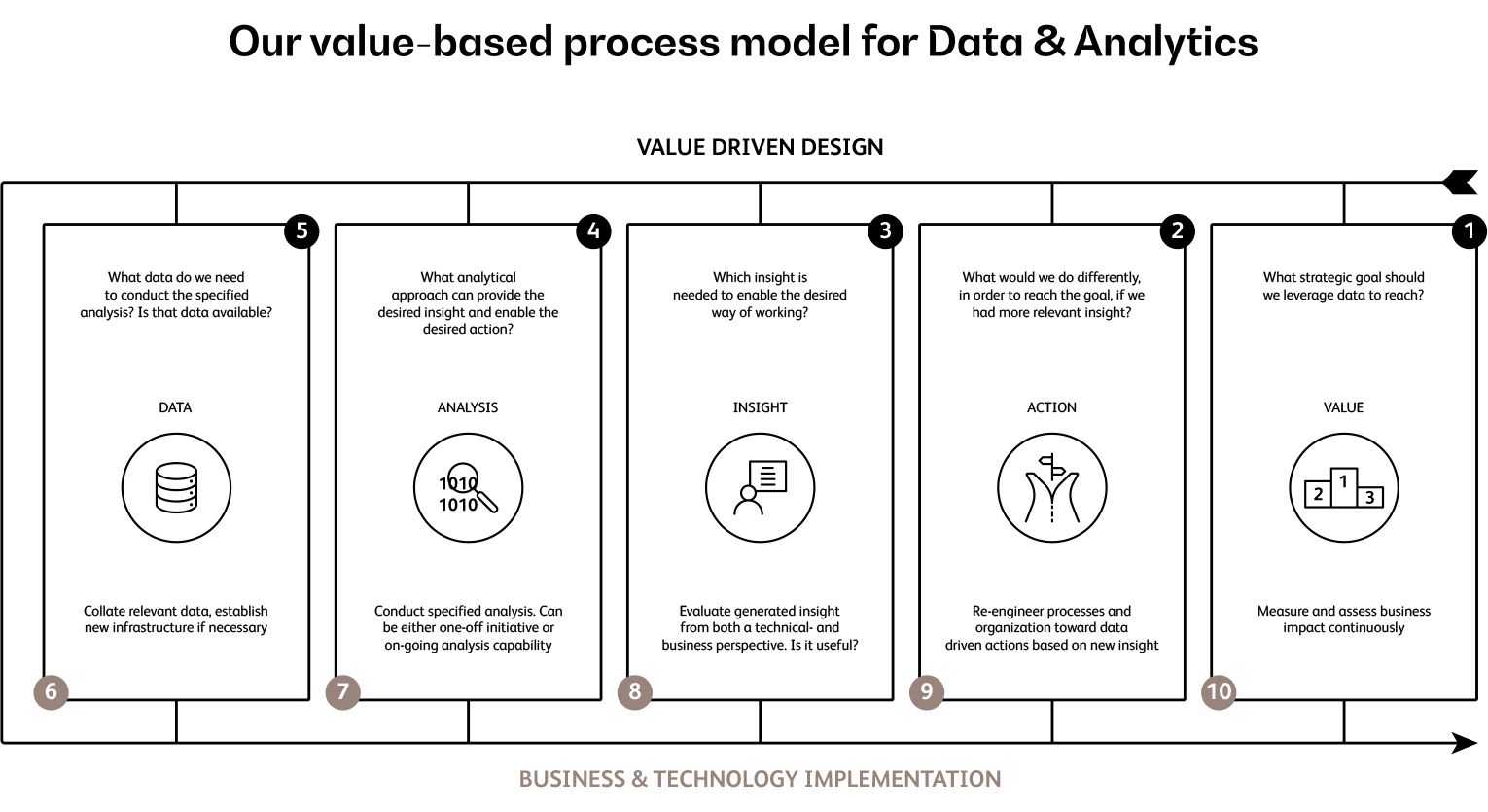 Our long-term project experience shows that the benefits must be clearly defined at the beginning of data-driven projects. We have developed a value-based process model based on our experience centered on approaching data-driven projects from the perspective of business benefits. A detailed data analysis should only occur after defining concrete questions or possibilities for decision support.
