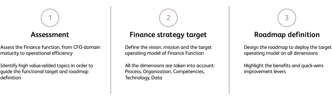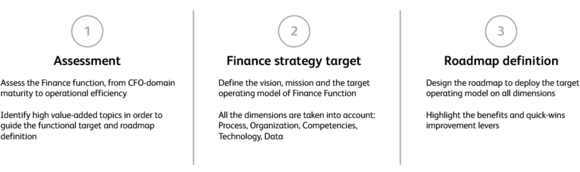 BearingPoint has developed a time-limited finance strategy approach of a few weeks, aiming at a sustainable finance transformation. Create finance-driven value for your company thanks to our great finance expertise embedded in a three-steps method which encompass the assessment of your current finance function, the definition of the finance strategy target and the roadmap to successfully achieve it.