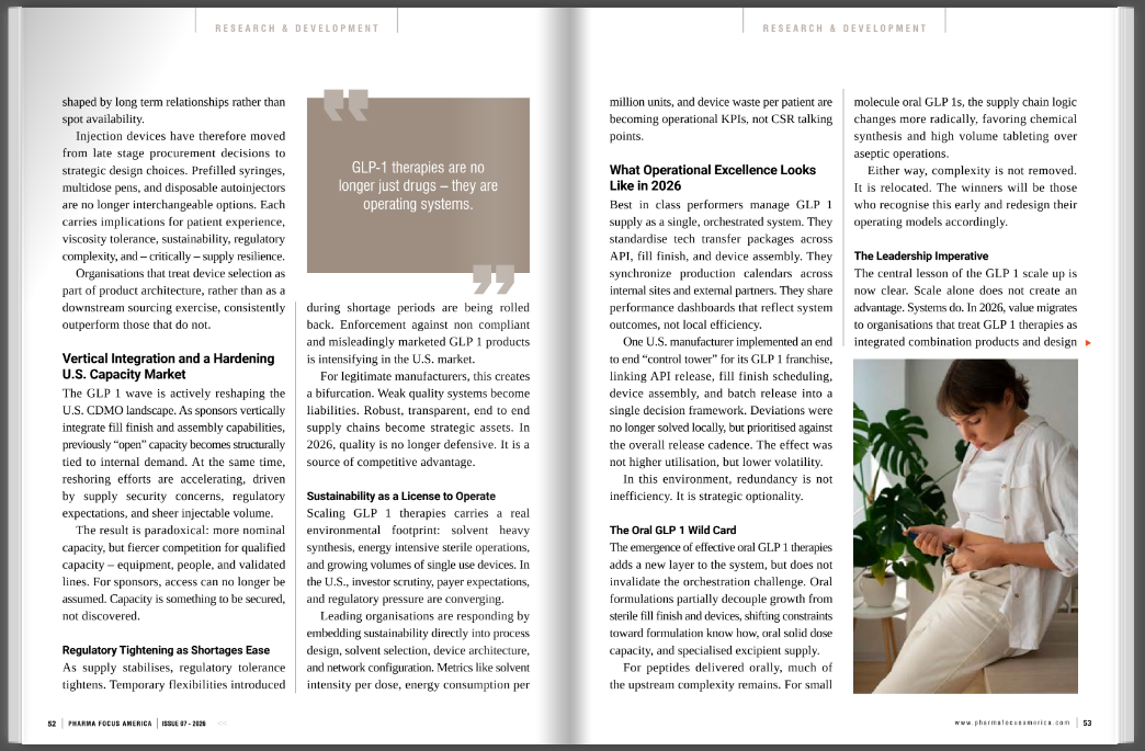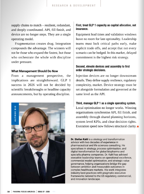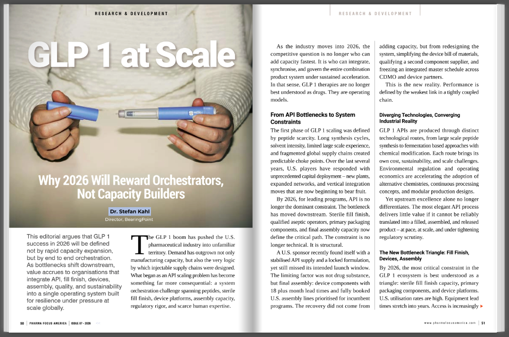 Complementing this perspective, Dr. Stefan Kahl offers a forward‑looking view on the GLP‑1 market and the transformation of injectable supply chains in the United States. He argues that the industry has entered a phase where bottlenecks have shifted downstream – from API to fill‑finish, device assembly, and packaging – requiring companies to think in systems rather than silos. Success is no longer defined by the fastest capacity expansion but by the ability to orchestrate complex, interdependent value streams under pressure. As he writes: