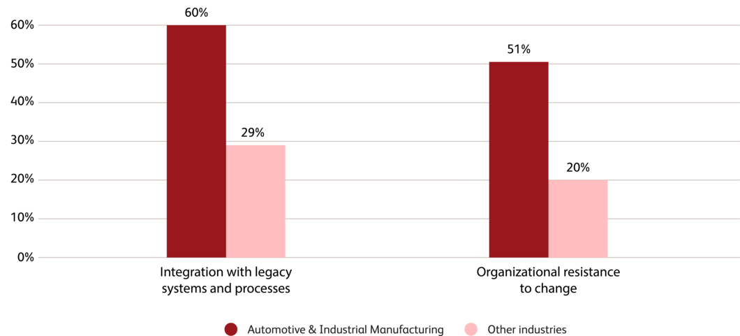 60% of companies in the automotive and industrial manufacturing sectors see integration with legacy IT and production systems as the biggest hurdle, compared to 29% in other industries.