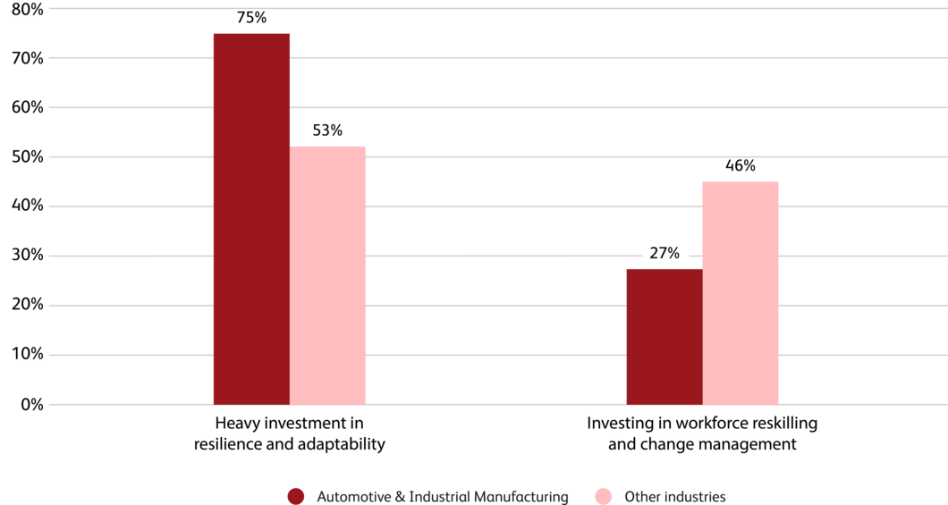 Instead of investing in specific skills, companies in automotive and industrial manufacturing are disproportionately investing in resilience and organizational adaptability (75% vs. 53%). The emphasis is on the ability to endure uncertainty, manage change, and adapt structures quickly.
