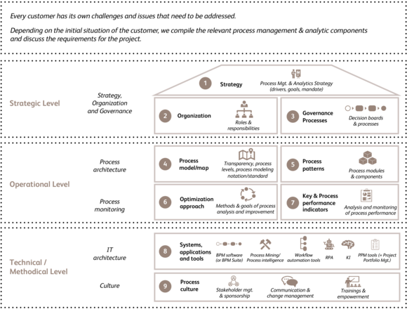 1. Development of a process management strategy for your company (for example) based on an organizational BPM maturity analysis, which can be used to determine the status quo and a target picture for BPM in your company and thus serve as a basis for planning further steps.
