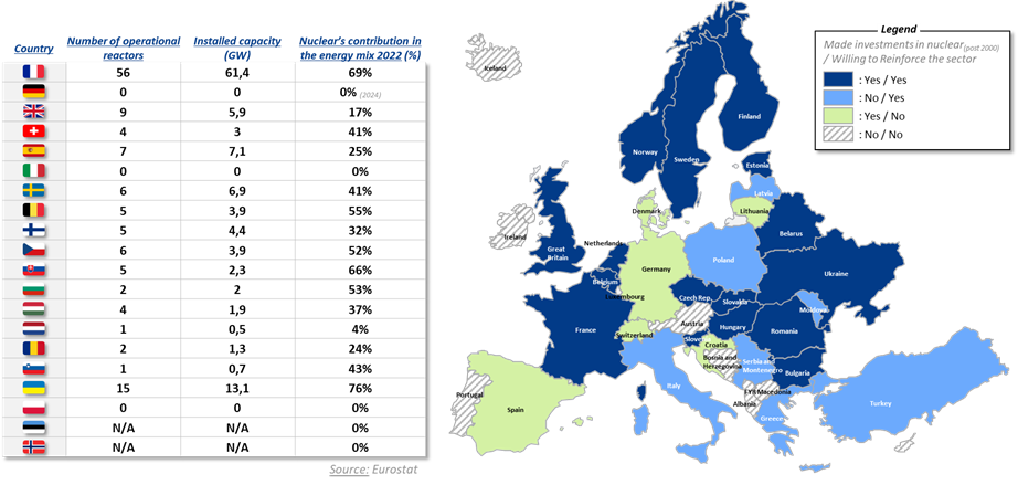 To complement the visual overview of Europe’s nuclear landscape, the table below dives deeper into the political ambitions and strategies shaping nuclear energy development across European nations as of 2025. It provides a detailed account of each country's approach, highlighting key government initiatives, planned investments, and the role of nuclear power in their energy strategies. From France's ambitious EPR2 program to Sweden's focus on next-generation reactors and Poland's collaboration with global nuclear leaders, this table underscores the diversity of political positioning and industrial commitments across the continent.