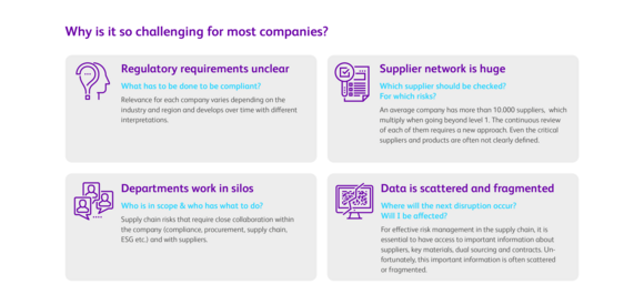 Regulations like LkSG in Germany, and to a greater extent, the future European directive, make gaining transparency beyond tier 1 essential. Our partnership with Everstream Analytics provides a unique AI-based solution to automate the identification of n-tier suppliers.
