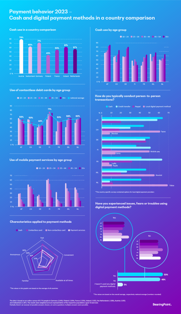 The survey was designed by BearingPoint and conducted by the market research institute YouGov in the seven countries mentioned. The results were analyzed by the BearingPoint payments experts. BearingPoint has conducted the survey regularly in the DACH region since 2019 and expanded the panel to other European countries this year.