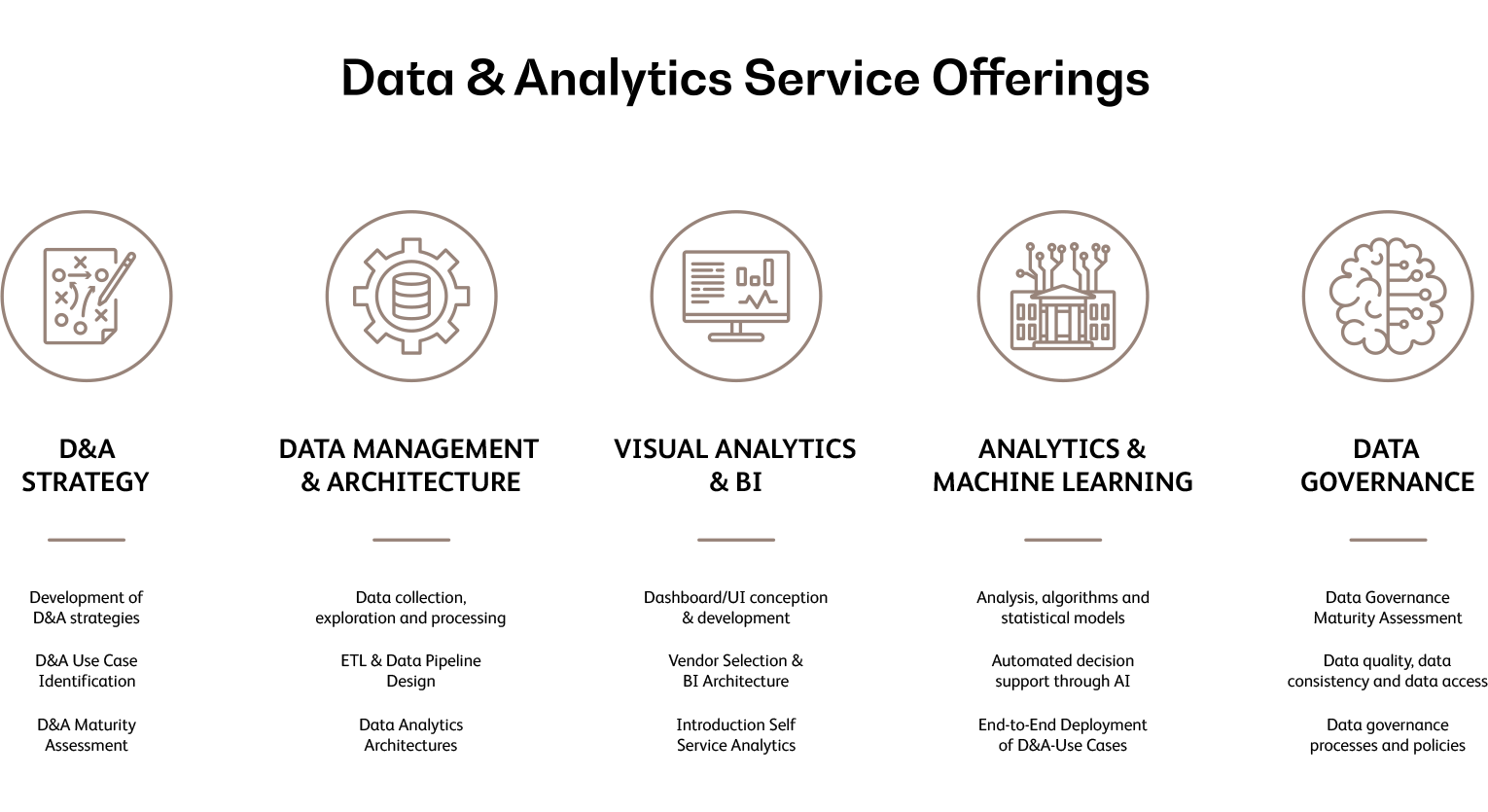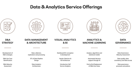 Whether it’s an AI strategy workshop to identify use cases, developing a proof of concept for a cross-departmental dashboard, or end-to-end implementation, our experts support you throughout your AI journey and help you bridge the gap between AI strategies and day-to-day operations. We bundle our D&A offerings as part of five service offerings – but we’re also happy to advise you on individual requests at any time. Please feel free to contact us!